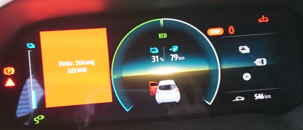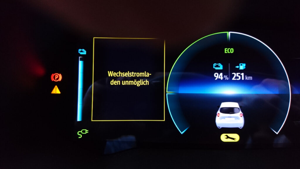 - 30./31. Januar 2021 (Wochenende): Sowohl am Samstag als auch am Sonntag mehrmalige Ladeversuche (Wallbox und öffentliche Ladesäule) werden mit der Fehlermeldung „Elektr. Störung GEFAHR“ rot hinterlegt abgebrochen. Ist doch am ZOE etwas kaputt? Notladekabel mit Schuko-Stecker und der ZOE lädt 30% in ca. 10 Stunden. Also dann am Montag in die Werkstatt