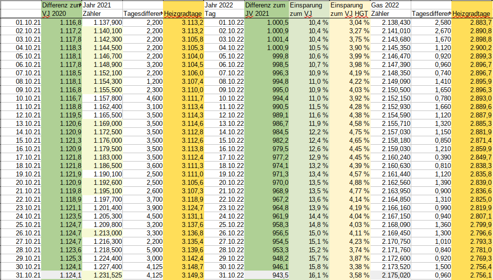 Die leicht gelb markierten Zählerstände im Oktober 2021 habe ich interpoliert, da ich im Oktober 2021 den Gaszähler nicht jeden Tag abgelesen habe. Die orange unterlegten Heizgradtage sind die Summe aller Tage genau ein Jahr zurück. Als Beispiel der 3. Oktober 2021 hat den Wert von 3.105,8. Dies ist die Summe aller Heizgradtage vom 4. Oktober 2020 bis zum 3. Oktober 2021. Im Vergleich dazu der 3. Oktober 2022 hat einen Wert von 2.898,8 und dies ist die Summe alle Heizgradtage vom 4. Oktober 2021 bis 3. Oktober 2022.