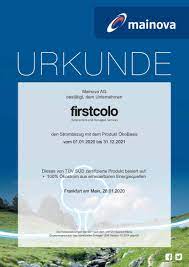 Unter Zertifizierungen findet sich dann auch das Zertifikat des Ökostroms (siehe rechts) der Mainova AG (ÖkoBasis). Aktualisierung im Mai 2022: Das Bild des Zertifikats wurde von First Colo entfernt. Daher hier neben an nur noch eine entsprechende Verkleinerung.