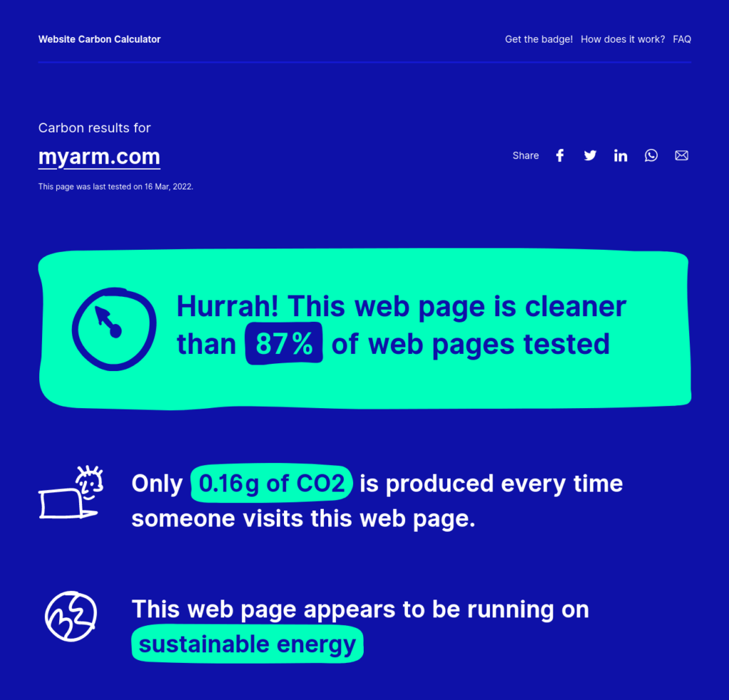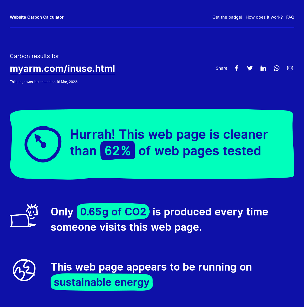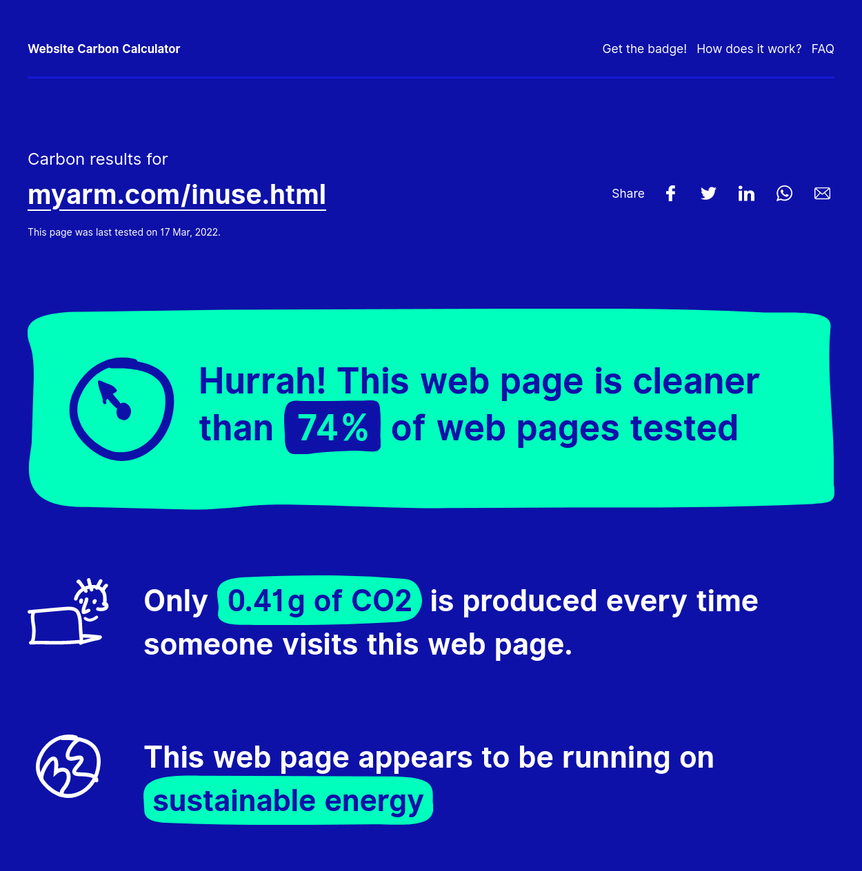In diesem Artikel möchte ich kurz beschreiben, wie ich meine Bilder, Fotos und Screenshots ins Webp Format gewandelt habe und welche positive Auswirkung dies auf das Klima haben kann. Um dies besser zu veranschaulichen habe, ich eine Analyse meiner Firmen-Webseite myarm.com durch den Internet Dienst „Website Carbon Calculator“ (auf deutsch „Webseiten Kohlenstoff Rechner“) vor und nach der Konvertierung zu webp Grafikformat durchgeführen lassen. Als Ausgangspunkt habe ich die Startseite analysiert.